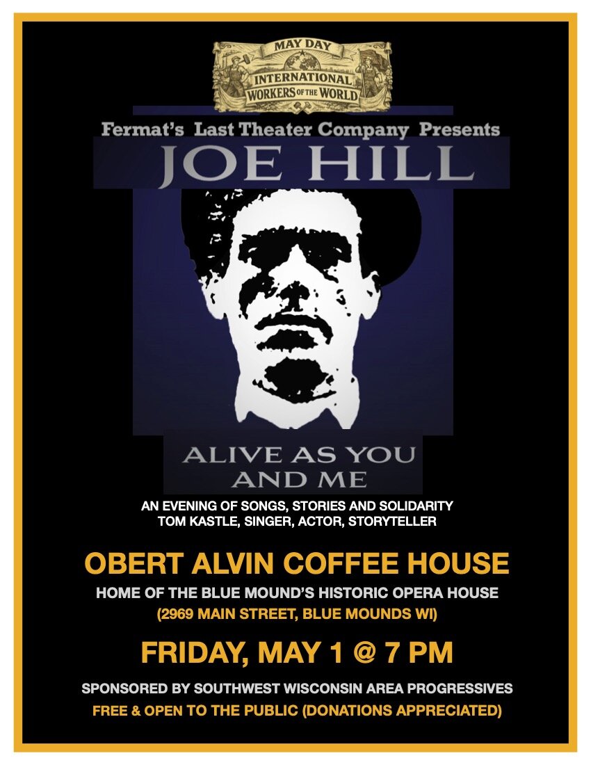Folksinger Tom Kastle’s performance of the musical play, Joe Hill, Alive as You and Me, celebrates the legacy of the martyred poet and labor leader. The tone is set by the script’s opening lines: